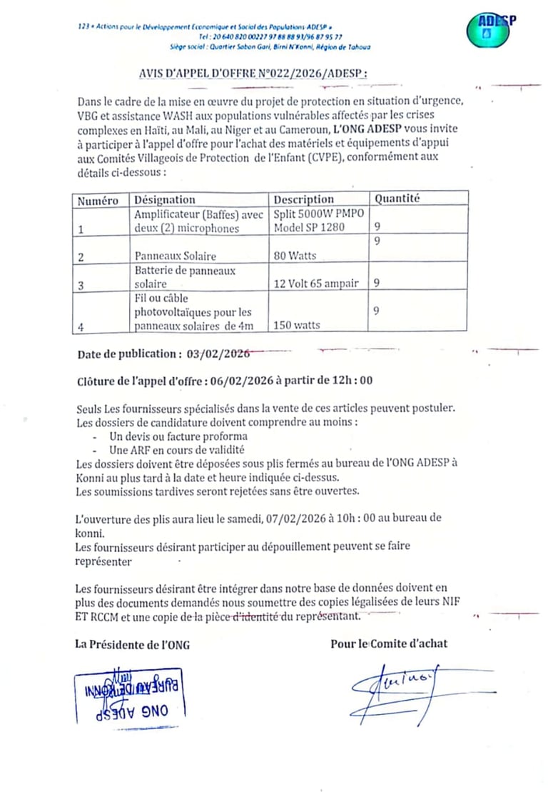 Dans le cadre de la mise en œuvre du projet de protection en situation d'urgence, VBG et assistance WASH aux population vulnérables affectés par les crises complexes en Haïti, au Mali, au Niger et au Cameroun, l'ONG ADESP vous invite à participer à l'appel d'offre pour l'achat des matériels et équipement d'appui aux comités Villageois de Protection (CVPE), conformément aux détails ci-dessus